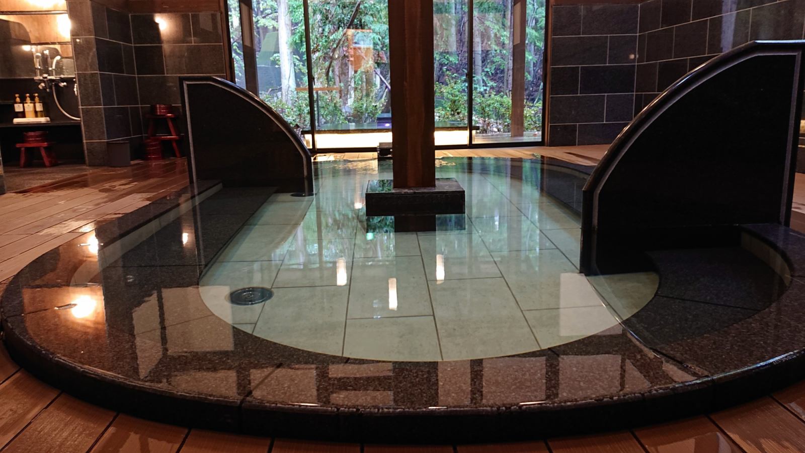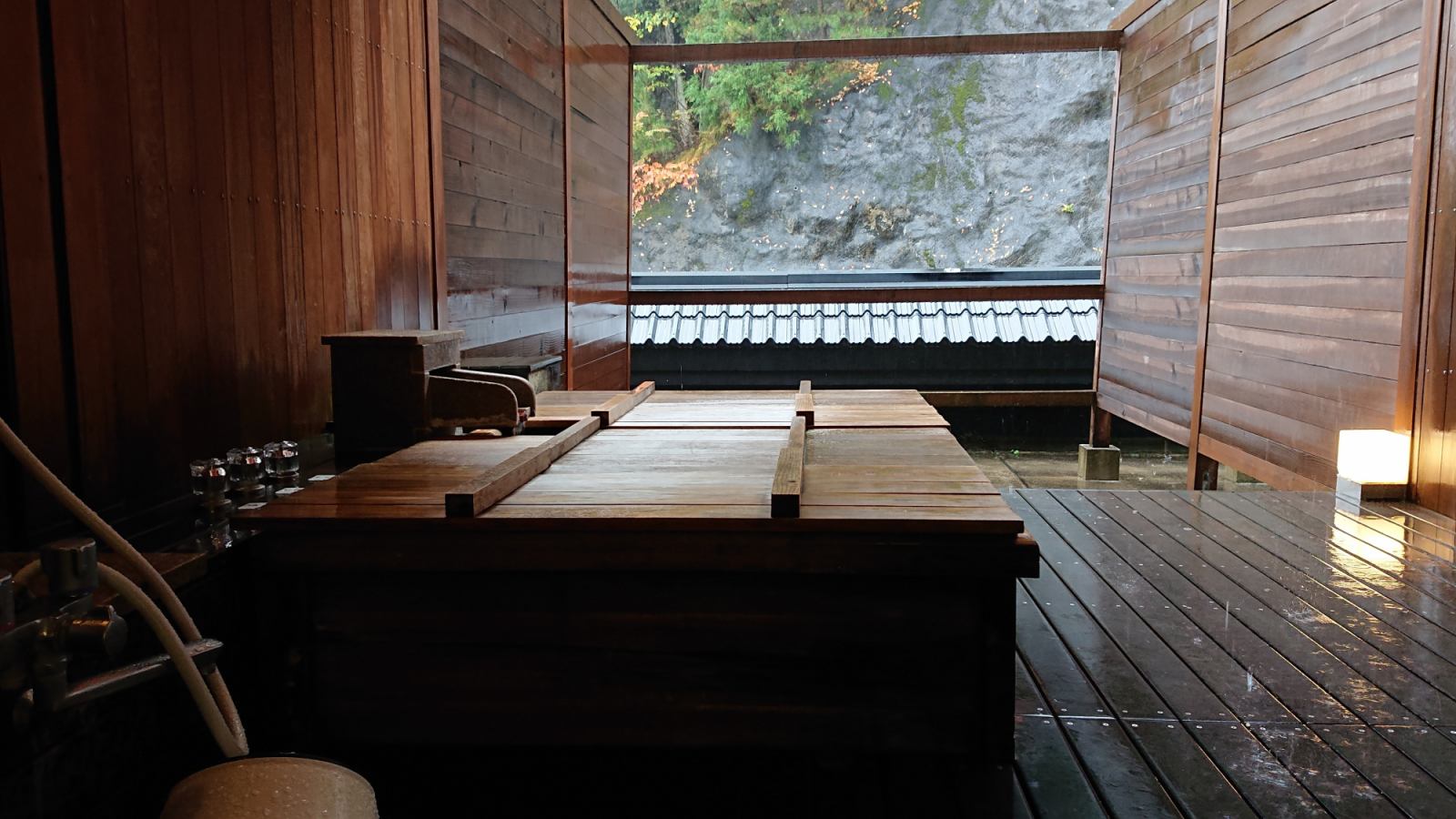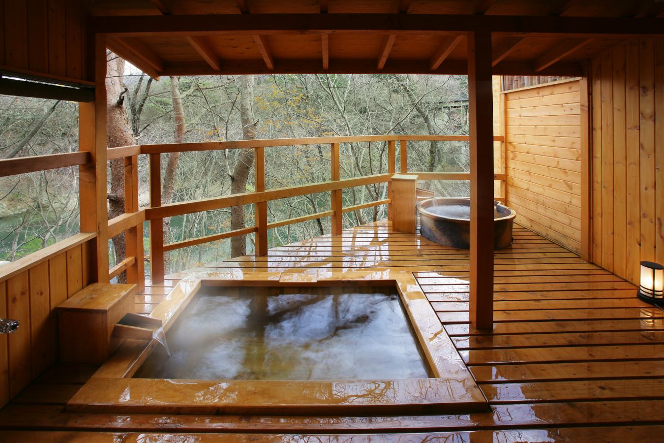 Communal bath in a reconstructed kominka surrounded by gardens