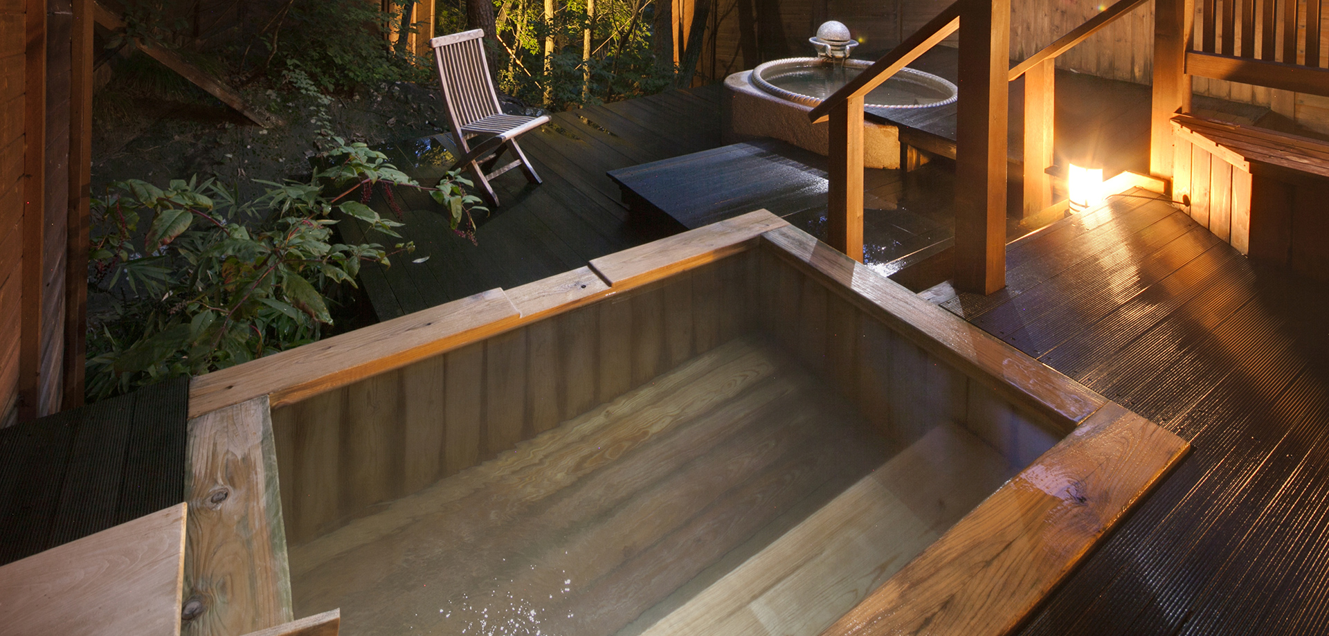 Marble-lined public bath and hinoki cypress open-air bath